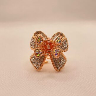 Gold alloy coated metal bow claw-clip, with an assortment of iridescent and clear glass stones. 4.5 cm length, 4 cm width.