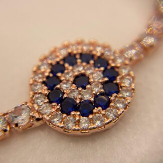 Rose-gold colour stainless steel tennis style bracelet, with navy blue and clear glass stone. 17 cm length, 1.3cm pendant width, with a 2.3 cm extender included.