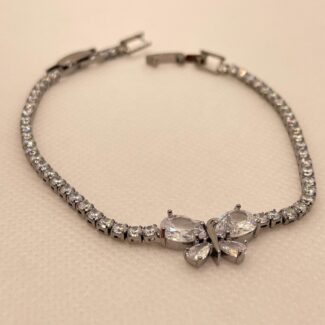 Gun-Metal Grey alloy plated butterfly tennis bracelet, with clear glass stones. 17.3 cm length, 1.2cm pendant width, 0.3 cm chain width, includes a 2.2 cm matching extender.
