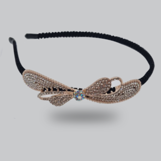 Metal headband wrapped in velvet ribbon, with a rose-gold metal butterfly applique with glass stones. Plastic casings on the end.