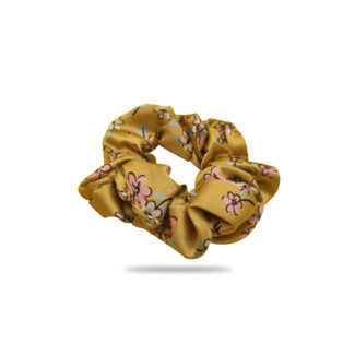 A soft creamy yellow coloured satin scrunchie, with large bow detail, with synthetic pearl embellishments.