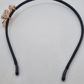 Metal headband wrapped in velvet ribbon, with a gold metal applique with glass stones. Plastic casings on the end.