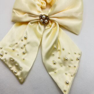 A soft creamy yellow coloured satin scrunchie, with large bow detail, with synthetic pearl embellishments.