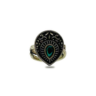 OXIDISED TEARDROP SHAPED TEXTURED ADJUSTABLE RING WITH SINGLE GREEN STONE.