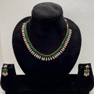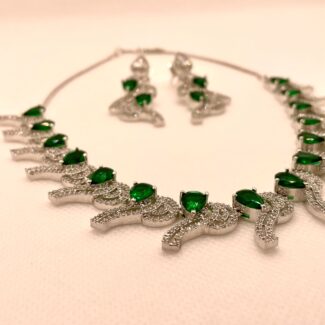 Silver alloy necklace and stud earring set, with green and clear glass stones. 43cm max length, 25cm min length