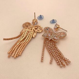 Rose-Gold alloy coated steel necklace and stud drop earring set, with white/clear glass stones. Adjustable necklace length with S-type clasp. Includes hair anchors for earrings.