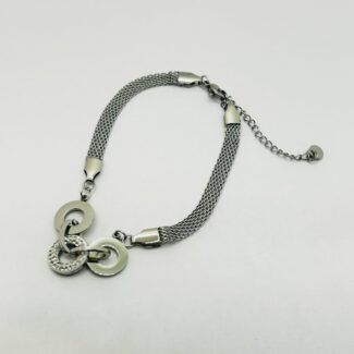 SILVER ALLOY THREE CIRCLE LINKED FOCAL WITH WHITE GLASS STONE BRACELET , PEARL ENDED CLASP. 26 CM LENGTH, ADJUSTABLE LENGTH.
