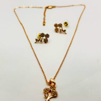 Rose-Gold alloy coated steel necklace and stud drop earring set, with white/clear glass stones. Adjustable necklace length with S-type clasp. Includes hair anchors for earrings.