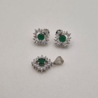 Stamped 925 sterling silver, stud earring and pendant set. With green garnet focal stones and a cubic zirconia halo.