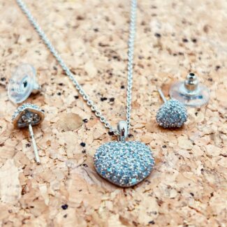 Stainless steel simple necklace with white stone paved heart shaped pendant and earrings. Adjustable length 43cm max length 37cm min length.