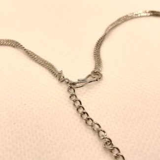 Silver alloy plated metal, with natural multi coloured glass stones. Adjustable length necklace with an S-type clasp. 46cm max length, 25cm min length