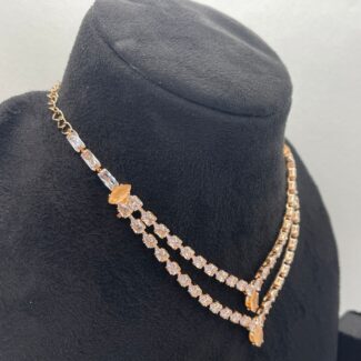Rose-Gold alloy, necklace and stud drop earring set, with white/clear, and orange glass stones. Adjustable necklace length with an S-type clasp.