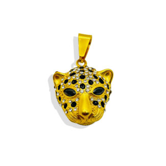 GOLD STAINLESS STEEL, BLACK APOXY AND WHITE GLASS STONED MOUNTAN LION HEAD PENDANT