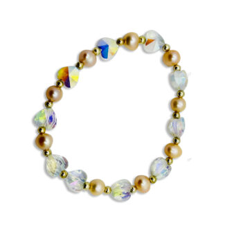 Synthetic gold pearl and iridescent heart bead elastic bracelet.